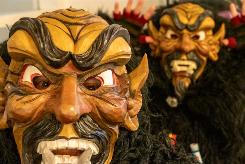Die Maske ist aus Holz geschnitzt und von Hand bemalt. Das Oberteil ist aus Bordeauxrotem Stoff genäht und die knielange Hose besteht aus Filzblätz in den Farben Bordeauxrot, Schwarz, Braun und Dunkelgrün. Dazu Ringelstulpen in denselben Farben. Das Oberteil hat zwischen Körper und Arme eingenähte Flügel. Ein Körbchen mit Gutsle und Eier ist immer dabei. Der Giggel verkörpert all` die armen Kreaturen, denen der Giggelbatscher so zugesetzt